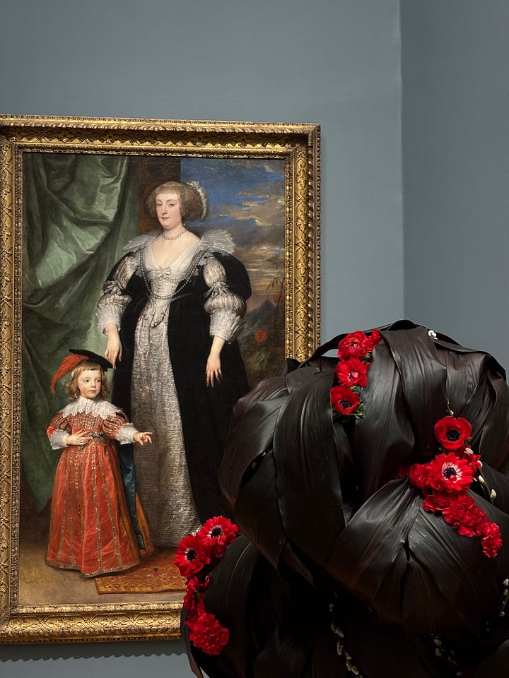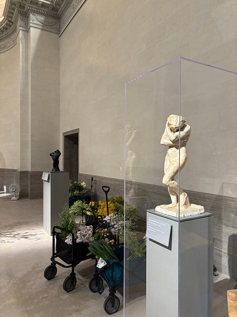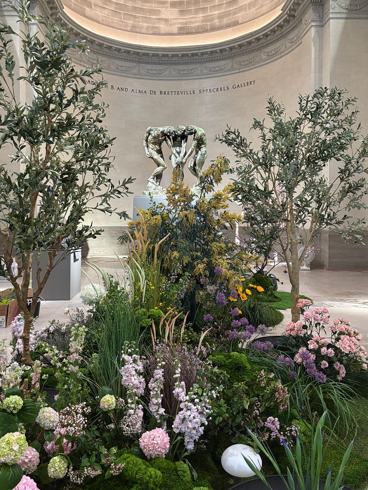 The centerpiece work of the presentation at the Legion of Honor is a collab with found floral called “The Artists’ Garden” that is being tended to all week. Just a few weeks prior I saw the Thom Browne runway show happen in this very gallery. Crazy!